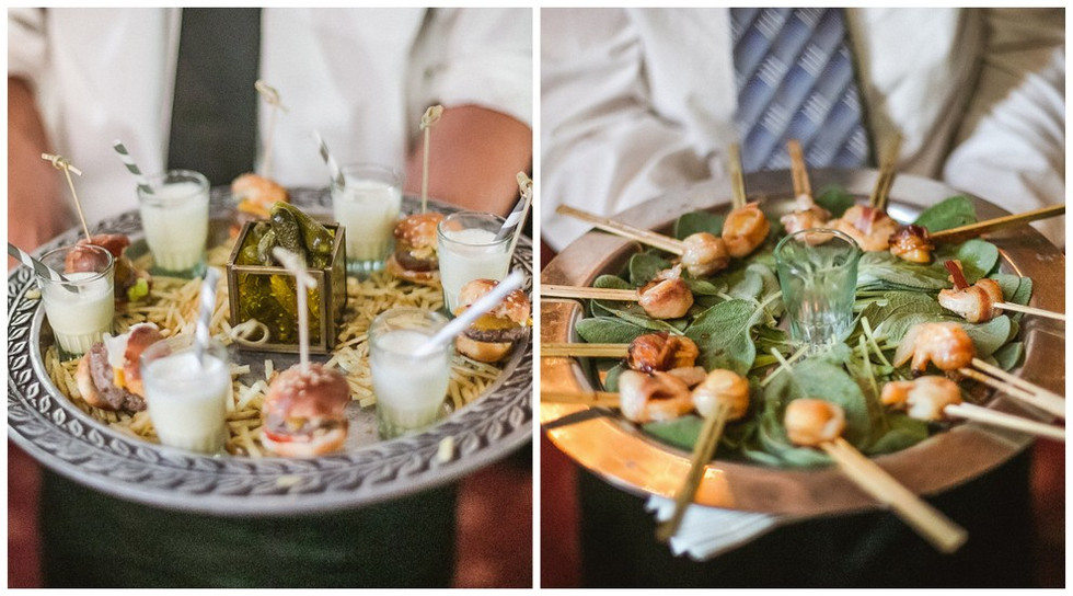 Appetizers: Cocktail Tarts // Grilled Prawns & Scallops wrapped in Maple Cured Bacon // Mini Patron Bottles of Margaritas & Grilled Fish Tacos on Limes // Cocktail Hamburgers & Mini Milk Shakes // Mini NY Hot Dogs with Petite Pints of Beer // Baby Lamb Chops with Mint Pesto // Seafood Ceviche